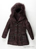 Теплый пуховик с двойной застежкой на молнию и металлические карабины. Капюшон отстегивается от изделия, мех отстегивается от капюшона. Оригинальный отложной ворот, два накладных кармана, внутренние трикотажные манжеты. Пояс на плотной резинке, низ изделия на кулиске. Декорирован кожаными хлястиками.
