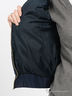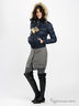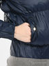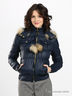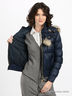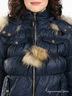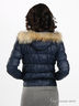 Утепленная куртка темно-синего цвета. Капюшон оторочен мехом. По краю воротника стойки кулиска с меховыми помпоном. Застегивается на молнию. Манжеты и низ изделия посажены на широкую резинку. Четыре кармана на кнопках.