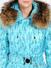 Яркий, эффектный пуховик. Уютный капюшон украшен красивым мехом енота. Застежка на молнию, два втачных кармана на молнии, в шлевки продет эластичный ремень с оригинальной пряжкой. Модель смотрится стильно, роскошно.