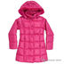Пуховик для девочки, цвета фуксии. Стеганный, длиной до колена, с капюшоном. Внутри рукава трикотажная манжета. Пуховик украшен тремя пластиковыми кнопками в цвет ткани.