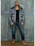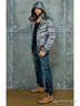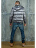 Классический мужской пуховик. Высокий воротник-стойка. Капюшон застегивается на кнопки. Застежка изделия спереди на молнию и на кнопки. Три прорезных кармана на молнии на груди. Два прорезных кармана на талии.