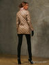 Стеганный пуховик средней длины, прямые рукава с манжетами, застежка-молния спереди, карманы: два на груди и два на уровне талии, воротник-стойка завязывается на декоративный бант.