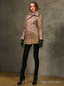 Стеганный пуховик средней длины, прямые рукава с манжетами, застежка-молния спереди, карманы: два на груди и два на уровне талии, воротник-стойка завязывается на декоративный бант.