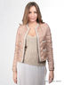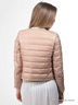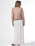 Элегантный женский пуховик. Круглый вырез горловины. Застежка спереди на молнию. Четыре накладных кармана. Ворот, карманы и разрез дополнены вставками из другой ткани.
