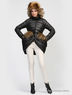 Стеганный пуховик, застежка на кнопки, воротник-стойка. Приталенный верх расходится фалдами на бедрах.
