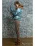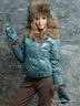 Оригинальный укороченный женский пуховик. Отложной меховой воротник. Застежка спереди на кнопки. Два прорезных кармана. Длинные прямые рукава дополнены декоративными разрезами на кнопках. По низу изделия идет декоративный пояс.