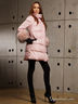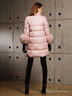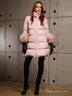 Стеганный пуховик трапециевидной формы, застежка на кнопки и молнию, воротник-стойка, прямые, немного укороченные рукава с манжетами из натурального меха песца.