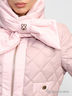 Стеганный пуховик средней длины, прямые рукава с манжетами, застежка-молния спереди, карманы: два на груди и два на уровне талии, воротник-стойка завязывается на декоративный бант.