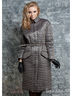 Классический приталенный длинный пуховик. Воротник-стойка. Застежка на молнию и на кнопки. Два прорезных кармана с клапанами. Укороченные рукава.