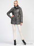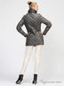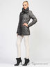 Стильный женский пуховик прямого покроя. Оригинальный ворот с драпировкой в виде банта. Застежка спереди на молнию. Четыре прорезных кармана на кнопках.