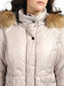 Пуховое пальто с капюшоном и застежкой на молнию. Ветрозащитный клапан с застежкой на кнопки. Капюшон отстегивается от изделия, мех отстегивается от капюшона. По бокам изделия - удобные втачные карманы с застежкой на кнопку. Внутри пуховика шелковистый подклад, втачной карман на молнии и накладной карман на пуговице.