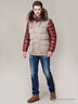 Стильный пуховик средней длины выполнен на контрасте двух видов материала. Особенностью модели являются отстегивающиеся рукава, благодаря чему куртка становится полноценным жилетом. Так же из контрастного материала выполнен съемный капюшон, отделанный натуральным мехом енота по краю. Удобные боковые и нагрудные карманы с клапанами и ветрозащитная планка центральной застежки-молнии делают изделие универсальным и практичным.