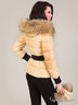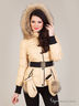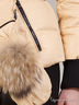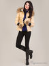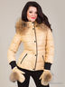 Универсальный пуховик средней длины приталенного силуэта выполнена с контрастными молниями, кантом по планке и воротнику, а так же контрастными трикотажными манжетами рукавов и декоративным съемным поясом, который подчеркивает линию талии. Съемный капюшон отделан опушкой из натурального меха енота. В качестве дополнения прилагаются варежки с меховыми помпонами.