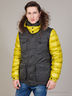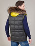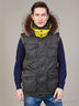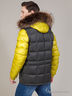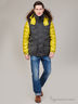 Стильный пуховик средней длины выполнен на контрасте двух видов материала. Особенностью модели являются отстегивающиеся рукава, благодаря чему куртка становится полноценным жилетом. Так же из контрастного материала выполнен съемный капюшон, отделанный натуральным мехом енота по краю. Удобные боковые и нагрудные карманы с клапанами и ветрозащитная планка центральной застежки-молнии делают изделие универсальным и практичным.