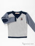 Пуловер прямого силуэта с V-образным вырезом горловины и длинным рукавом выполнен из плотного вязаного шерстяного материала. Контрастные вставки. Полочка украшена вышивкой и пришитым элементом.
