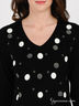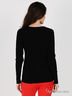 Стильный пуловер из эластичного вискозного трикотажа средней плотности с V-образным вырезом горловины и длинным рукавом. Полочка декорирована рисунками, стразами и пришитым бантиком. Отлично будет сочетаться с разными по фасону и фактуре вещами.