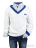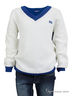 Классный лаконичный пуловер! Основной акцент на комбинации деталей - белая полочка и рукава красиво уравновешены синей спинкой и оформлением горловины, манжет и низа изделия. Прекрасное качество пряжи гарантирует мягкость, удобство, комфорт. В отделке - небольшой шеврон.