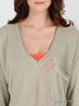 Оригинальный пуловер с укороченными рукавами и v-образным вырезом горловины. Свободного силуэта. Выполнен из гладкого вязаного материала с люрексом. Полочка украшена накладным карманом. Незаменимая вещь в гардеробе каждой женщины!