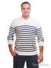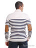 Мужской пуловер в полоску с длинными рукавами и шалевым воротником. Контрастные налокотники и кант на кармане-кенгуру. Края в рубчик.