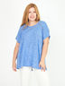 Пуловер с короткими рукавами и круглым вырезом из тонкого меланжевого трикотажа с ажурным узором. Длина ок.72 см. Параметры фотомодели: рост 172 см, российский размер 48.
