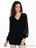 Детали: V-образный вырез; рукава из шифона с трикотажными манжетами; низ изделия дополнен трикотажной резинкой; полочка декорирована оригинальными нашивками с бусинами и пуговицами