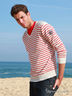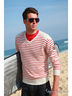 Пуловер в двухцветную полоску, V-образный вырез, края в рубчик 2x2, кокетка на плечах + однотонные налокотники, принт вверху рукава, нашивка сбоку.