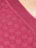 Пуловер мужской однотонный свободного силуэта средней плотности. Полочка выполнена фактурной вязкой в виде мелких квадратов. Рукав длинный. Вырез горловины V-образный. Низ изделия и рукавов оформлены трикотажной резинкой.