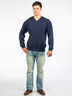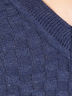 Пуловер мужской однотонный свободного силуэта средней плотности. Полочка выполнена фактурной вязкой в виде мелких квадратов. Рукав длинный. Вырез горловины V-образный. Низ изделия и рукавов оформлены трикотажной резинкой.