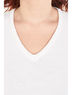 Уютный джемпер полуприлегающего силуэта белого цвета. Джемпер выполнен в технике «ручного вязания» из нитей с содержанием шерсти. V-образный вырез, низ изделия и втачных рукавов обработаны двусторонней лицевой бейкой.
