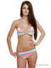 Бюстгальтер с треугольными чашечками на кулиске и классические плавки в разноцветную полоску.