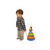 На основание пирамидки нанизываем поочерёдно 4 кольца, отличающиеся по диаметру и фактуре: 2 прозрачных пластиковых кольца с разноцветными гремящими шариками внутри и 2 разноцветных пластиковых кольца. У пирамидки устойчивое пластиковое основание на 3 колесиках. Малыш катает пирамидку за мягкую пчелку, прикрепленную к ее основанию.