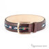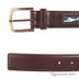 Кожаный ремень коричневого цвета с синтетической вставкой синего цвета с изображением вертолетов, пряжка темно-золотого цвета с гравированной надписью - JOHN DOUGLAS. Упаковка - стильная металлическая банка.