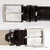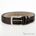 Оригинальный ремень с гладкой кожей под крокодила. Металлическая пряжка серебристого цвета.
