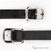 Черный кожаный ремень с металлической пряжкой серебристого цвета. Фактура ремня имитирует кожу рептилии.