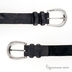 Черный ремень из мягкой кожи с металлической пряжкой серебристого цвета.