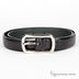 Черный кожаный ремень с металлической пряжкой серебристого цвета. Фактура ремня имитирует кожу рептилии.