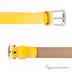Яркий желтый лаковый ремень с металлической пряжкой серебристого цвета.