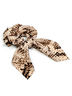 Резинка для волос «МАМБА» - это прочная эластичная основа, обшитая тонким легким текстилем, принтованным под змеиную кожу. Резинка декорирована небольшим узлом с двумя пышными струящимися «хвостами» ткани. Этот эффектный аксессуар станет настоящей находкой для модниц, ведь благодаря ему можно в считанные секунды преобразить свой наряд, придав образу смелые, игривые нотки.