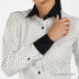 Белая рубашка в черный горошек с черной отделкой воротничка и манжет.
