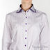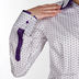 Очень яркая и модная рубашка из светлого хлопка с набивным рисунком и сложной контрастной отделкой фиолетового цвета. Манжета рукава на пуговице.