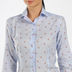 Тончайшая рубашка нежно-голубого цвета в орнамент пейсли рыжего цвета.
