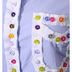 Детали: отложной ворот; укороченный рукав; два кармана; планка с пуговицами, нашивки на рукавах и окантовка карманов в виде контрастной рюши с разноцветными пуговицами