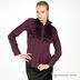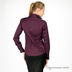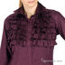 Рубашка классического кроя из лоснящегося материала бардового цвета. Отложной воротник на стойке. Полочка украшена рюшами. Планка-застежка на пуговицах. На груди и спинке вытачки, обеспечивающие посадку по фигуре.