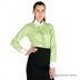 Замечательная рубашка из хлопка салатового цвета. Воротник и манжета рукава контрастного белого цвета, манжета с пуговицами. Планка декорирована рюшами.