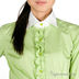Замечательная рубашка из хлопка салатового цвета. Воротник и манжета рукава контрастного белого цвета, манжета с пуговицами. Планка декорирована рюшами.