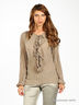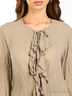 Рубашка прямого кроя из тонкой струящейся ткани. Горловина украшена воланами. Рукава присборены.