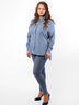 Рубашка свободного силуэта, выполнена из фактурной креповой ткани. По переду изделия расположены нагрудные вытачки. Застежка на кнопки. Рукав втачной полной длины на манжете. Воротник отложной, декорирован люверсами. По спинке идет кокетка. Спинка рубашки длиннее переда, в боковых швах находятся разрезы с закруглениями. Предусмотрены тонкие завязки для фиксации на талии, на концах металлические наконечники.