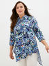 Блуза прямого кроя с рукавом 3/4, отложным воротником. Застежка на пуговицы. Ассиметричный низ. Контрастный принт.
