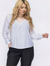 Лёгкая рубашка из жатого материала в полоску. Модель свободного кроя с V-образным вырезом горловины.