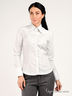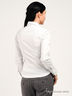 Детали: отложной воротник стойка, застежка на планку с пуговицами, длинные рукава с манжетами на пуговицах, кокетки спереди и на спинке, ткань модели с тонкой блестящей металлической нитью.